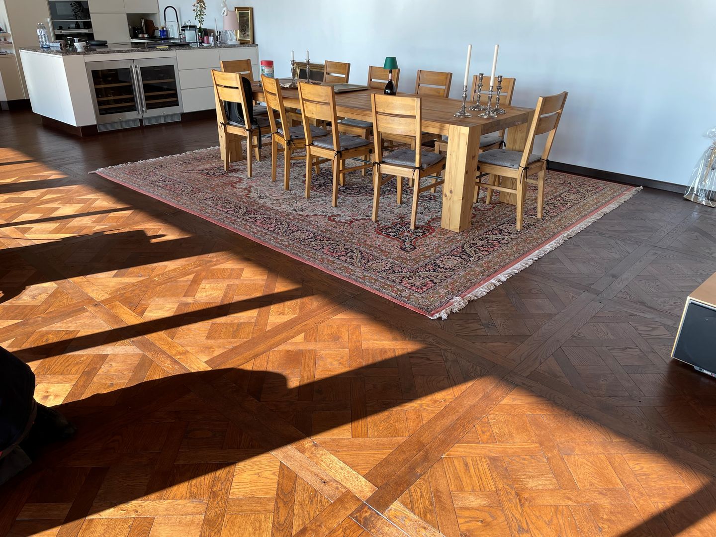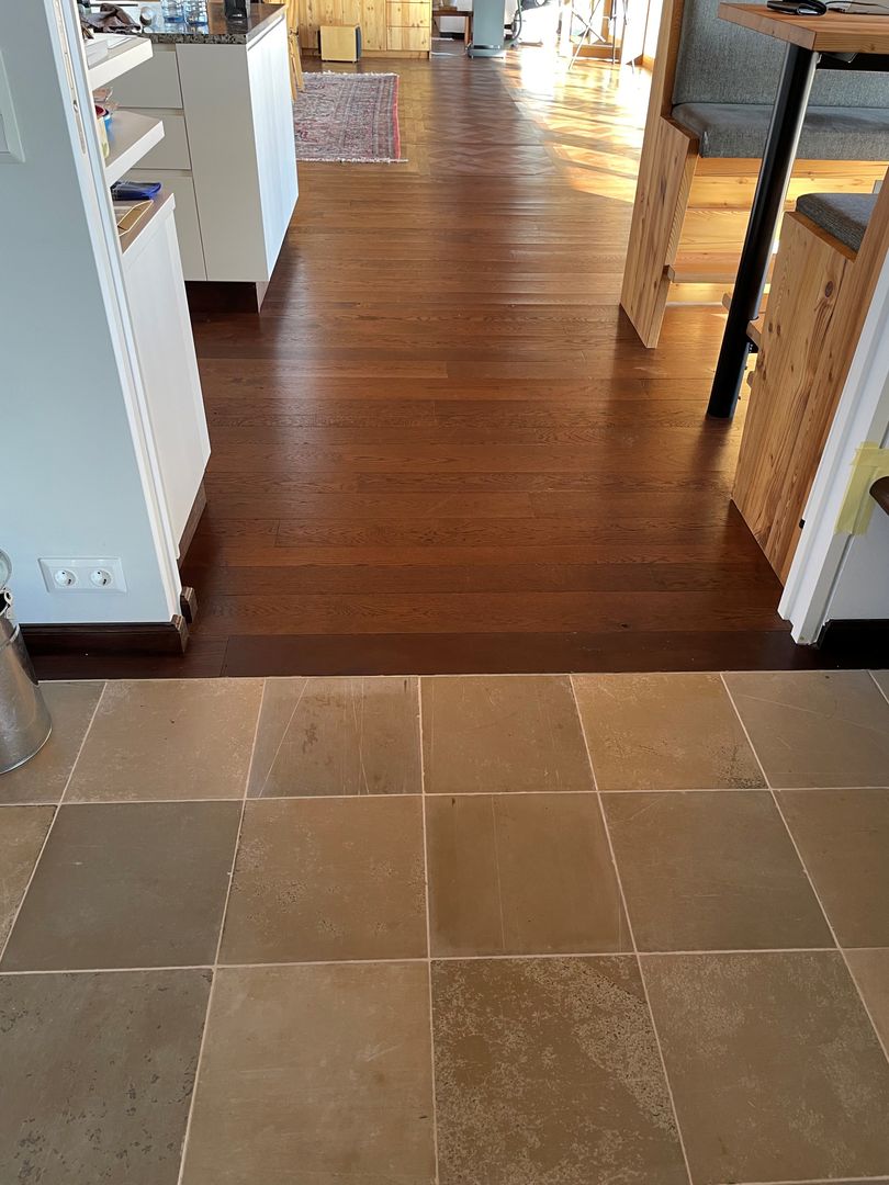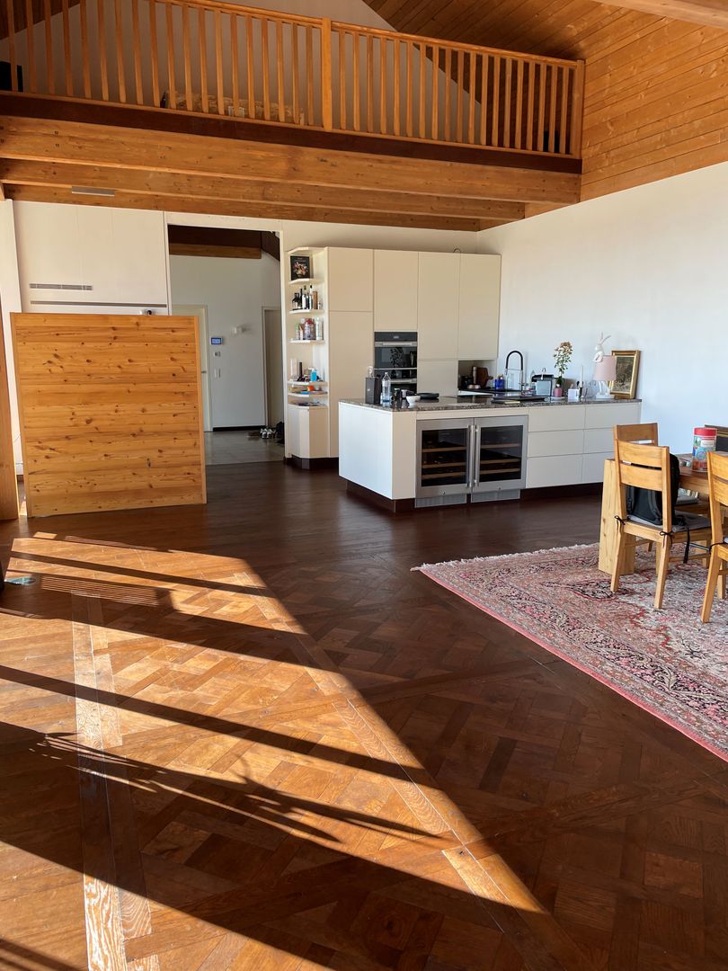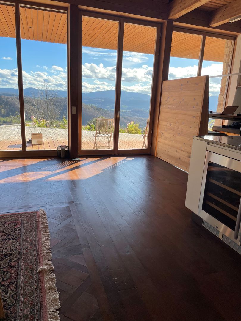 In diesem exklusiven Projekt wurde ein hochwertiger massiver Tafelparkett im Versailles-Muster aus Eiche verlegt. Besonders beeindruckend sind die großformatigen 1x1m Tafelparkett-Elemente im Wohnzimmer, das durch eine riesige Glasfront mit natürlichem Licht durchflutet wird. Der Parkett wurde in einem edlen rotbraunen Farbton veredelt, der perfekt mit der rustikalen Eleganz des Landhauses harmoniert.