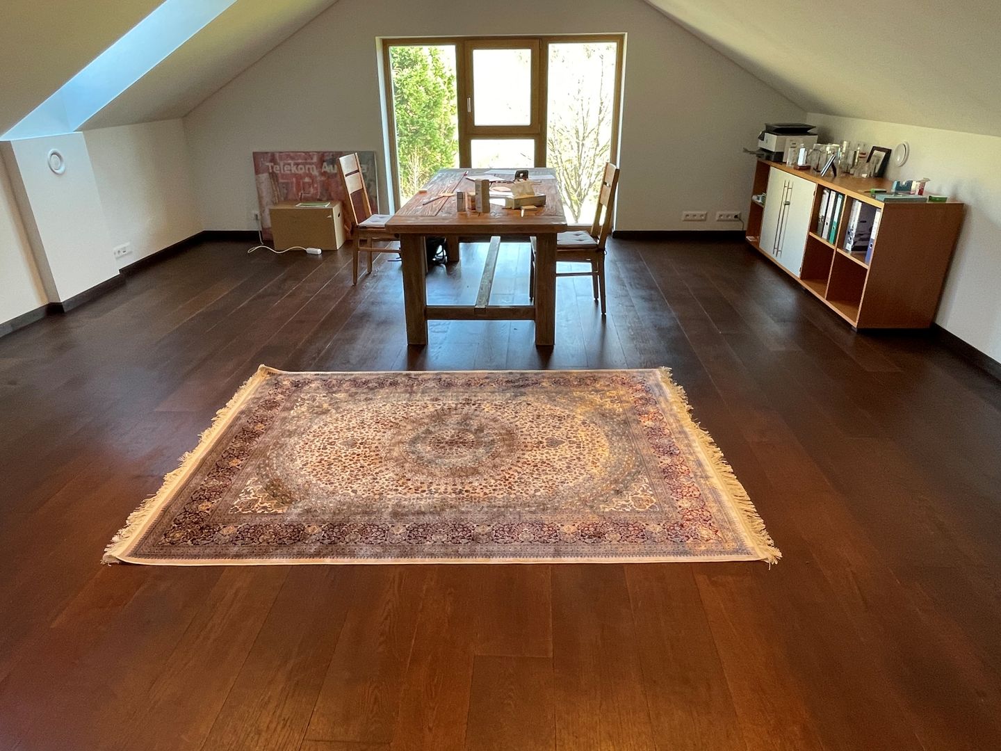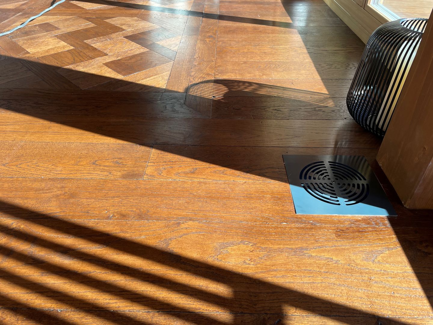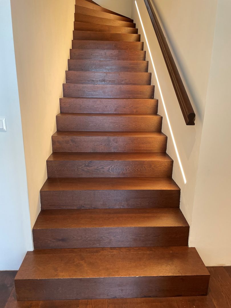 In diesem exklusiven Projekt wurde ein hochwertiger massiver Tafelparkett im Versailles-Muster aus Eiche verlegt. Besonders beeindruckend sind die großformatigen 1x1m Tafelparkett-Elemente im Wohnzimmer, das durch eine riesige Glasfront mit natürlichem Licht durchflutet wird. Der Parkett wurde in einem edlen rotbraunen Farbton veredelt, der perfekt mit der rustikalen Eleganz des Landhauses harmoniert.